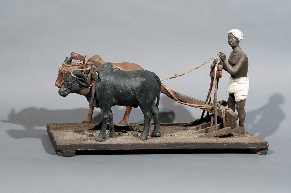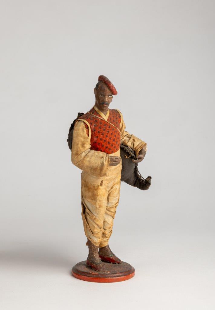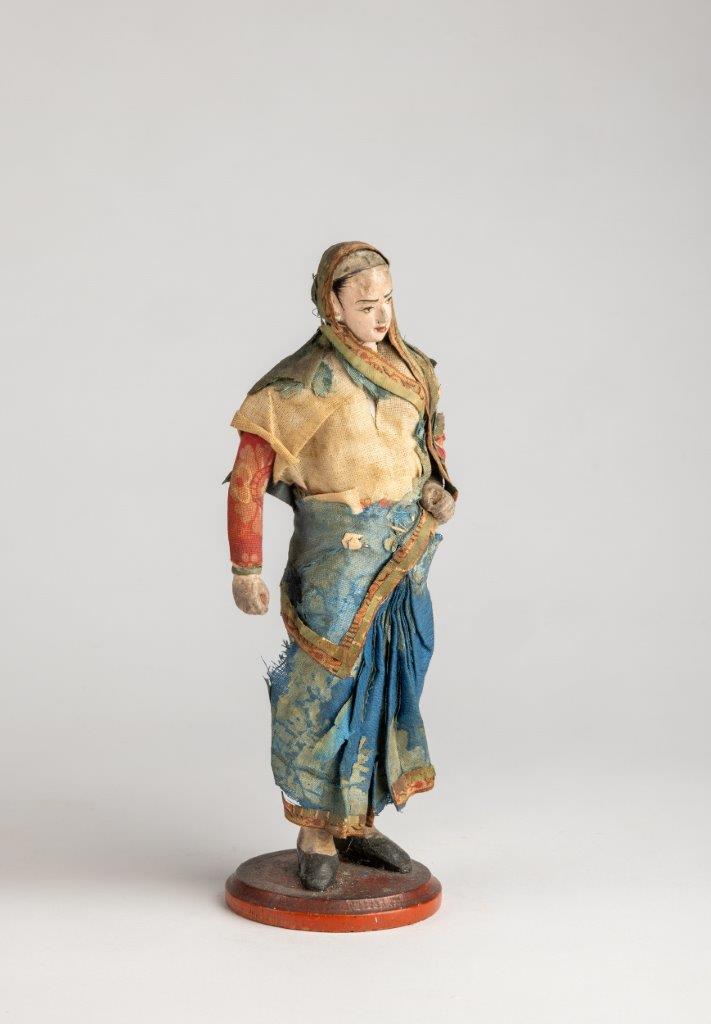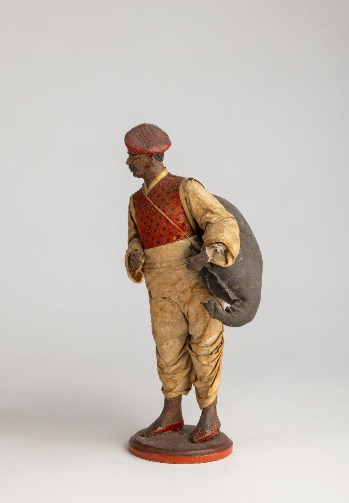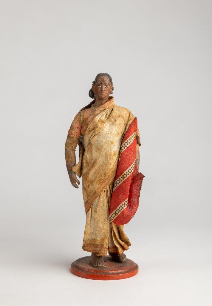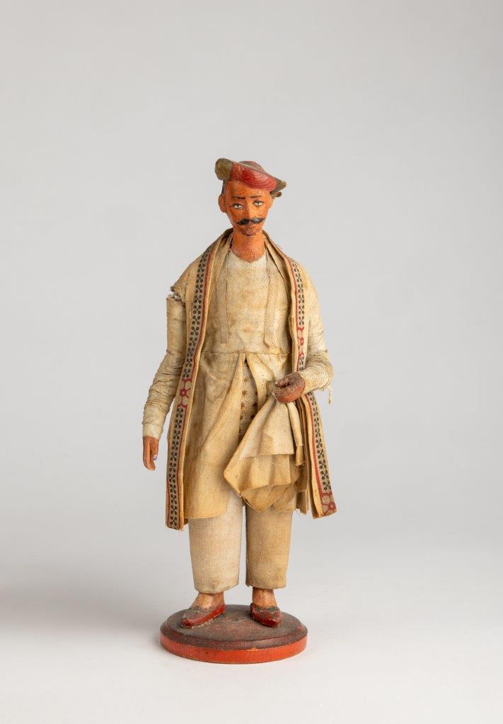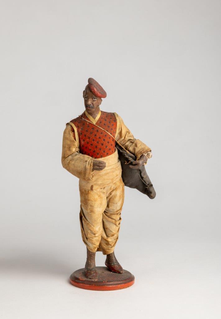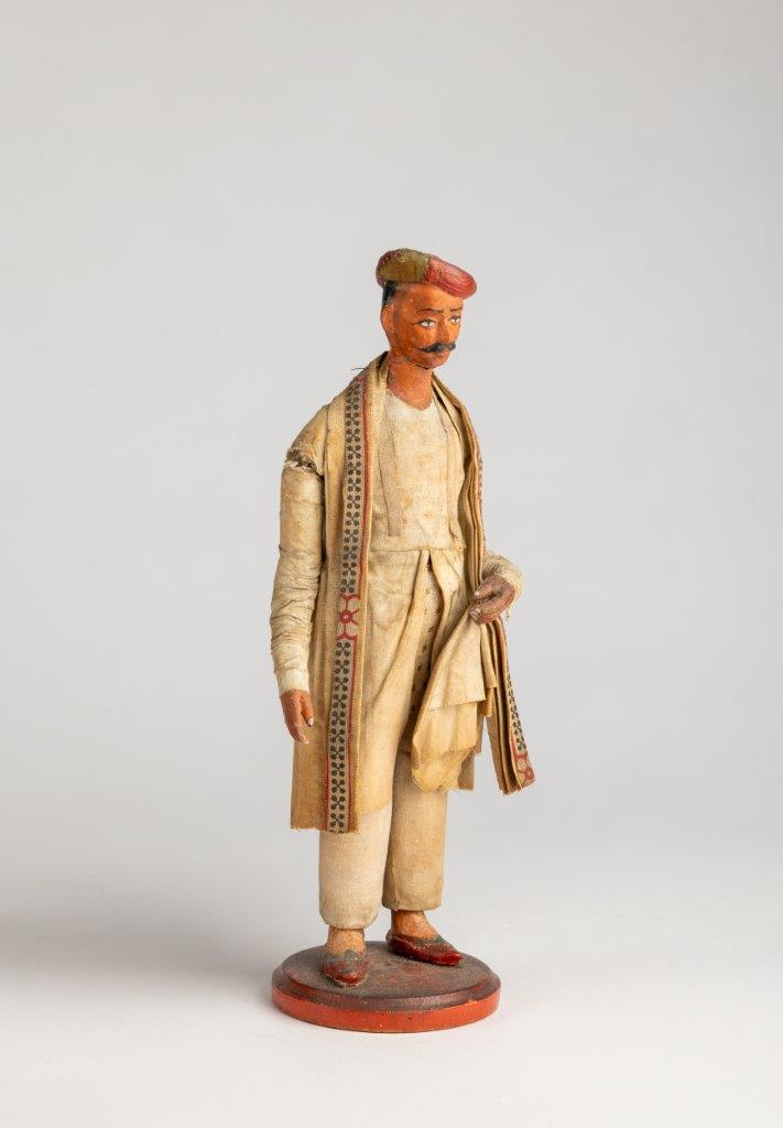 Pune in the Bombay Presidency was yet another centre of realistic clay figures. The Poona clay figures, much like the Krishnanagar ones, have superior finish and used pieces of cloth for dresses. T.N. Mukharji mentions that Bapuji Supekar, a jingar (a leather saddle-maker) and Kaluram Govandi (a brick layer) first opened shops in Poona to sell their clay figures. Mukharji also mentions names of modellers like Tatya Vevhari, Sitaram Joshi, Daji Narayan, Sukhram Seth Sonar, Raghopant and Maroti Gurav. The CSMVS has a significant collection of these Poona clay figures of early 20th century depicting different communities. Similar to Krishnanagar, Puna clay figures were also made of fine clay and mixed with cotton to avoid breakage. Different parts of the figures were hand modeled separately and joined with wooden pegs and clay paste. The complete figure was then attached to a wooden base. These figures were sun-dried and then painted with mineral colours and in some cases pieces of cloth were used for dresses, turbans etc. Occasionally body hair was added. Interestingly the accessories indicating the professions of the figures were made from materials in actual use in the professions, like the paper bundles in the hands of a clerk, wood cutter with a bundle of wood, a metal needle and thread in the hands of a tailor, all tools used by a jeweller. Dr. Bhau Daji Lad Museum, Mumbai, has several clay figures in its collection that depict the people, lifestyles, occupations and culture of Bombay of late 19th ~ early 20th century. The models were made at the museum probably by local artists in early 1900s. However, these figures do not have the finished look of the Puna clay figures.