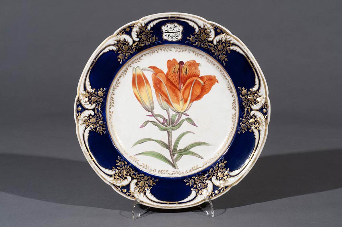 Ephemera Carnactic Plates Index Plates from the Carnatic Service » Previous Next » Chamberlains Worcester Plates Made for the Nawab of the Carnatic. Underglaze blue border with embossed floral decoration. Soft paste porcelain Diameter 26 cms The flower is described on the reverse of the plate as 'Orange Lily'. This is taken from 'Curtis's Botanical Magazine' Plate 36. 1787 Similar dishes can be viewed in the V&A collection and the Museum of Royal Worcester