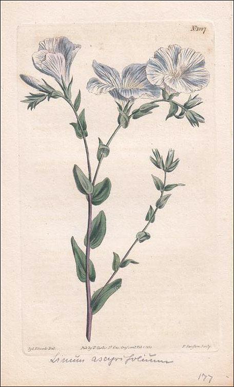 Blue & white flax with pale blue flowers, native of Europe. Hand coloured copperplate engraving from a botanical illustration by Sydenham Edwards