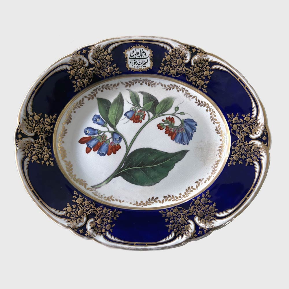 A Chamberlain's Worcester plate from the Carnatic Service dated 1820, painted with botanical specimens within blue moulded borders picked out in white and gilt, a small panel inscribed in Arabic with 'Amir-al-Hind Nawab Azam Jah Bahadur 1236 Hjri', the date corresponding to 1820 AD, the plate painted with a specimen of Rigid-Leaved Gorteria copied from William Curtis's designs for the Botanical Magazine, Vol 3, pl. 90. Titled in red to the underside, printed marks, 25.6cm.