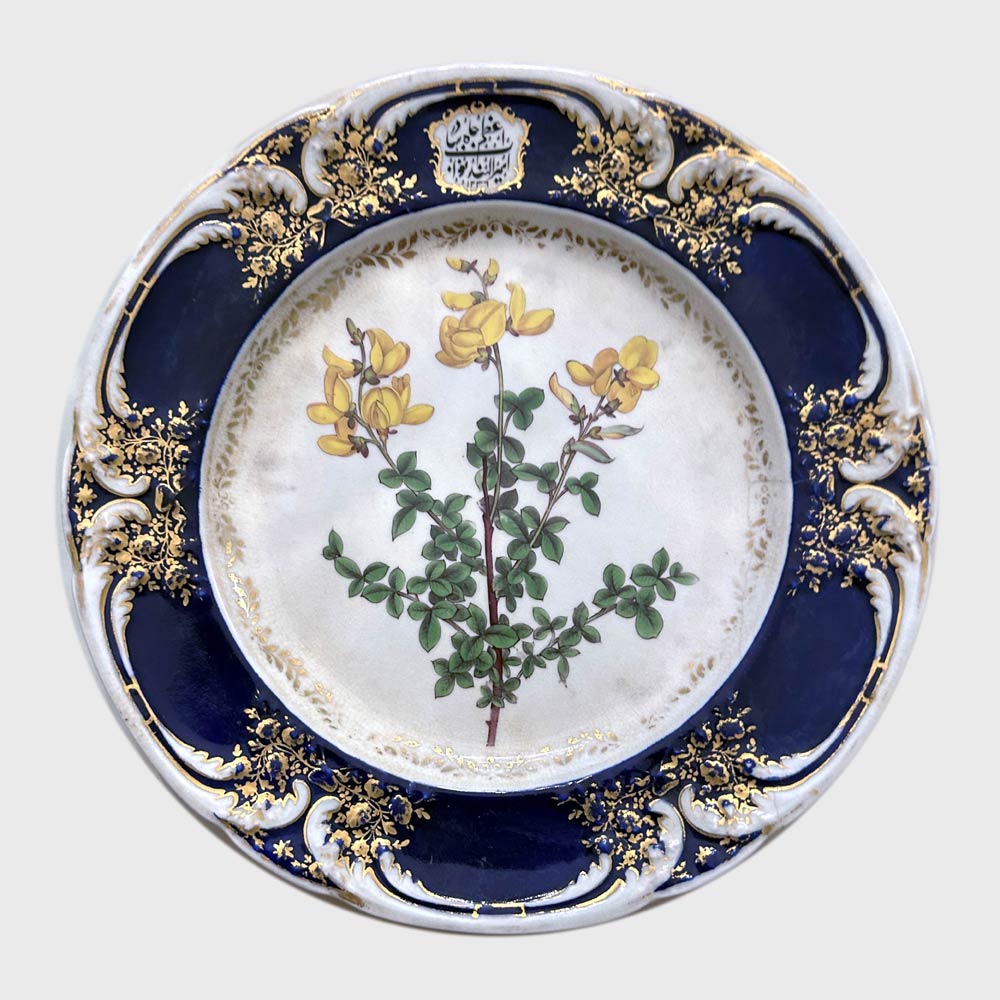 A Chamberlain's Worcester plate from the Carnatic Service dated 1820, painted with botanical specimens within blue moulded borders picked out in white and gilt, a small panel inscribed in Arabic with 'Amir-al-Hind Nawab Azam Jah Bahadur 1236 Hjri', the date corresponding to 1820 AD