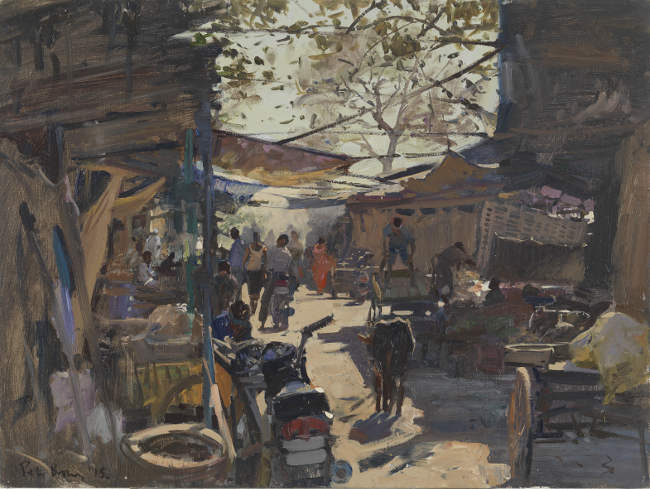 Ken Howard lives and works in London. His work hangs in the National Army Museum, the Imperial War Museum, the Guildhall Art Gallery and the Ulster Museum. Ken Howard is a life long plein air artist and his remarkable commitment to this practice is evidenced supremely by his travelling at the age of 82 to paint in India. He's been traveling to India with Patrick and Peter every year for the past 4 years, painting in the streets and markets which as any one who's been to India knows, is very full on. It's really a younger man's game but Ken is intrepid. And he enjoys the company of younger spirits who share his enthusiasm for painting on location.