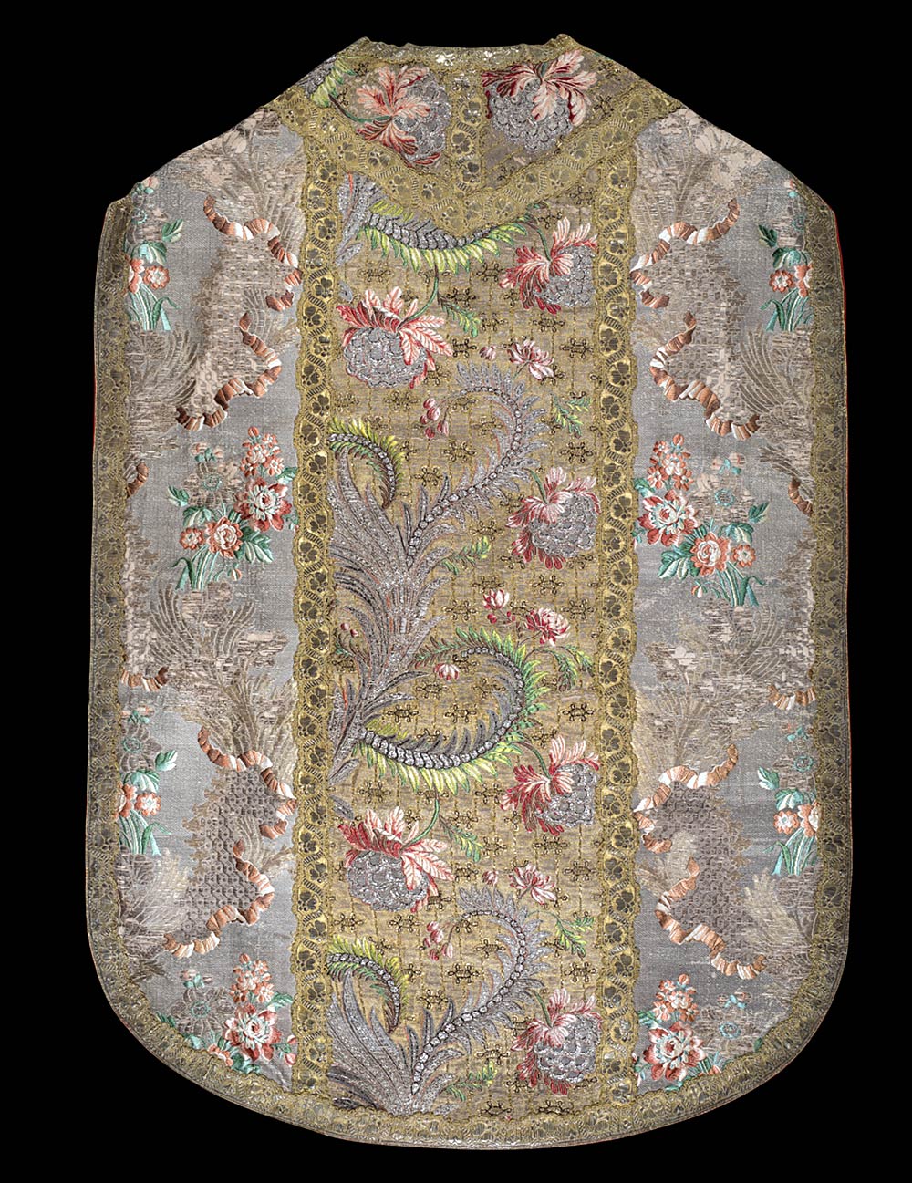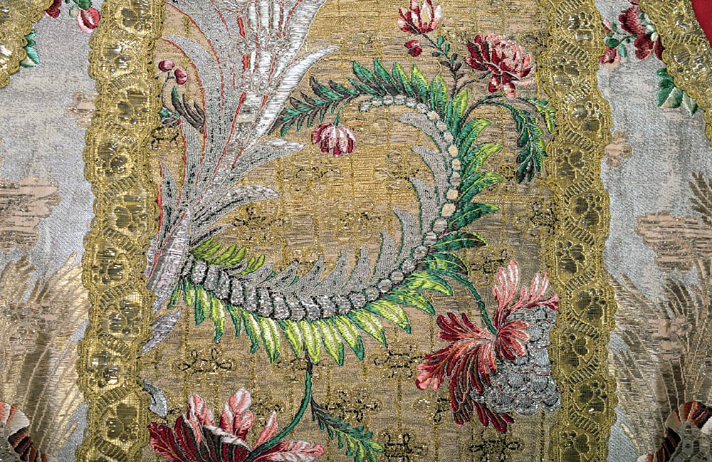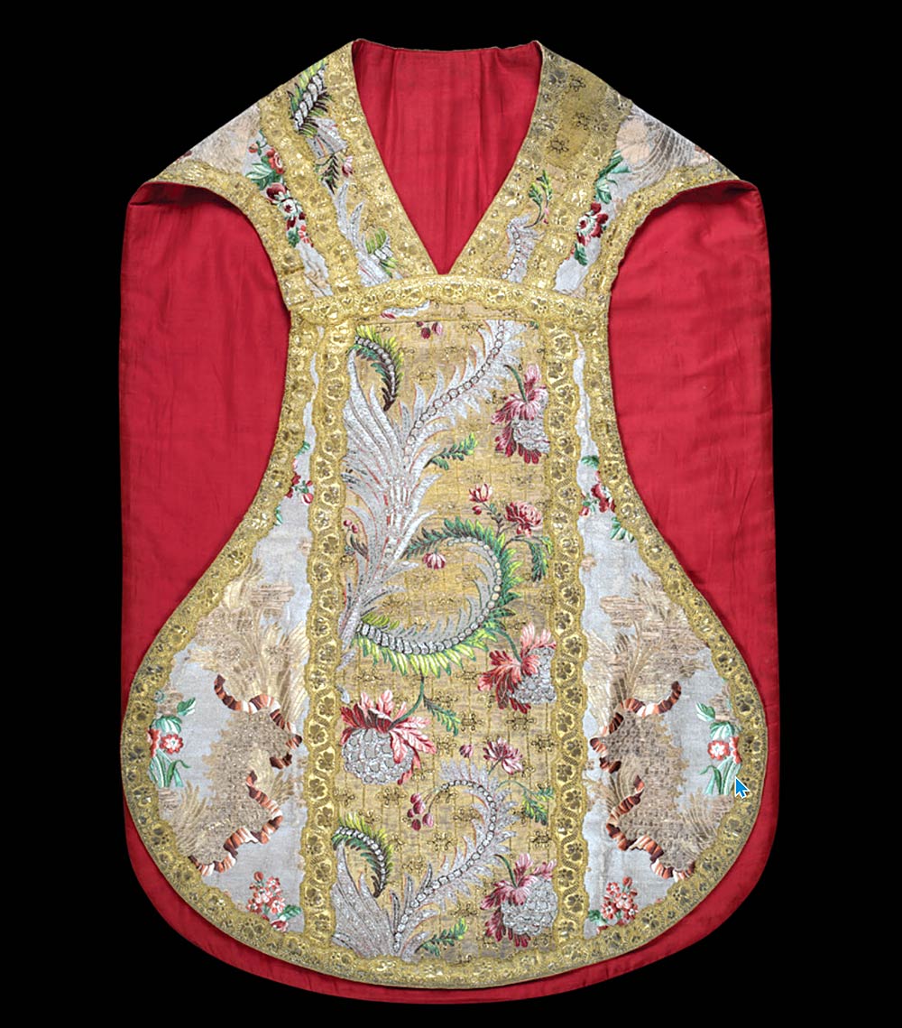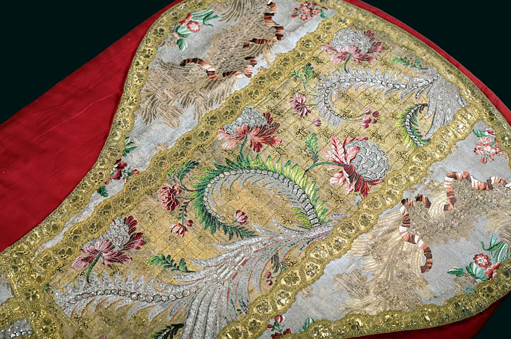 Background material, cloth of silver, spun and crushed silver, around 1740, overstitched and brocaded with polychrome and gold thread. Orphrey: brocaded cloth of gold with silver thread embroidery, (spun and crushed), gold (spun and crushed) and polychrome “diamond” silk, gold braid (very rare material, never previously seen by Xavier Petitcol). Gold braid structure, undulating on the edge of the decoration, twisted around the orphreys. Very high-quality Roman style chasuble. The background material is decorated with rivers of lace, ribbons and flowers with bunches of flowers peeking out. The « reversible » weave makes the design perfectly symmetrical on either side of the orphrey. The particularly rich orphreys are decorated with ferns, palms, flowers and fruit from India and a diamond effect produced by using blades of silver.